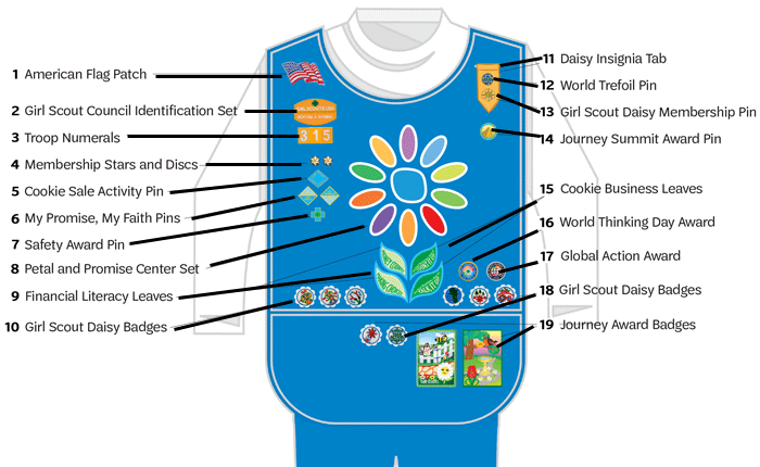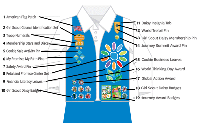 Note – New leaders and parents need to be aware that the leaves under the petals on all uniform guides have been retired (Cookie Business leaves in summer of 2021 and Financial Literacy leaves in summer of 2022). Their replacements are the flower shaped badges and go where #10 indicates. You no longer need to save room for the leaves when placing petals, but you can use that space for extra flower shaped badges.