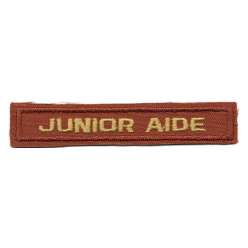 The Junior Aide Award badge should go under the Rainbow Bridging Badge (if earned) or the membership stars (if no Rainbow Bridging Badge).