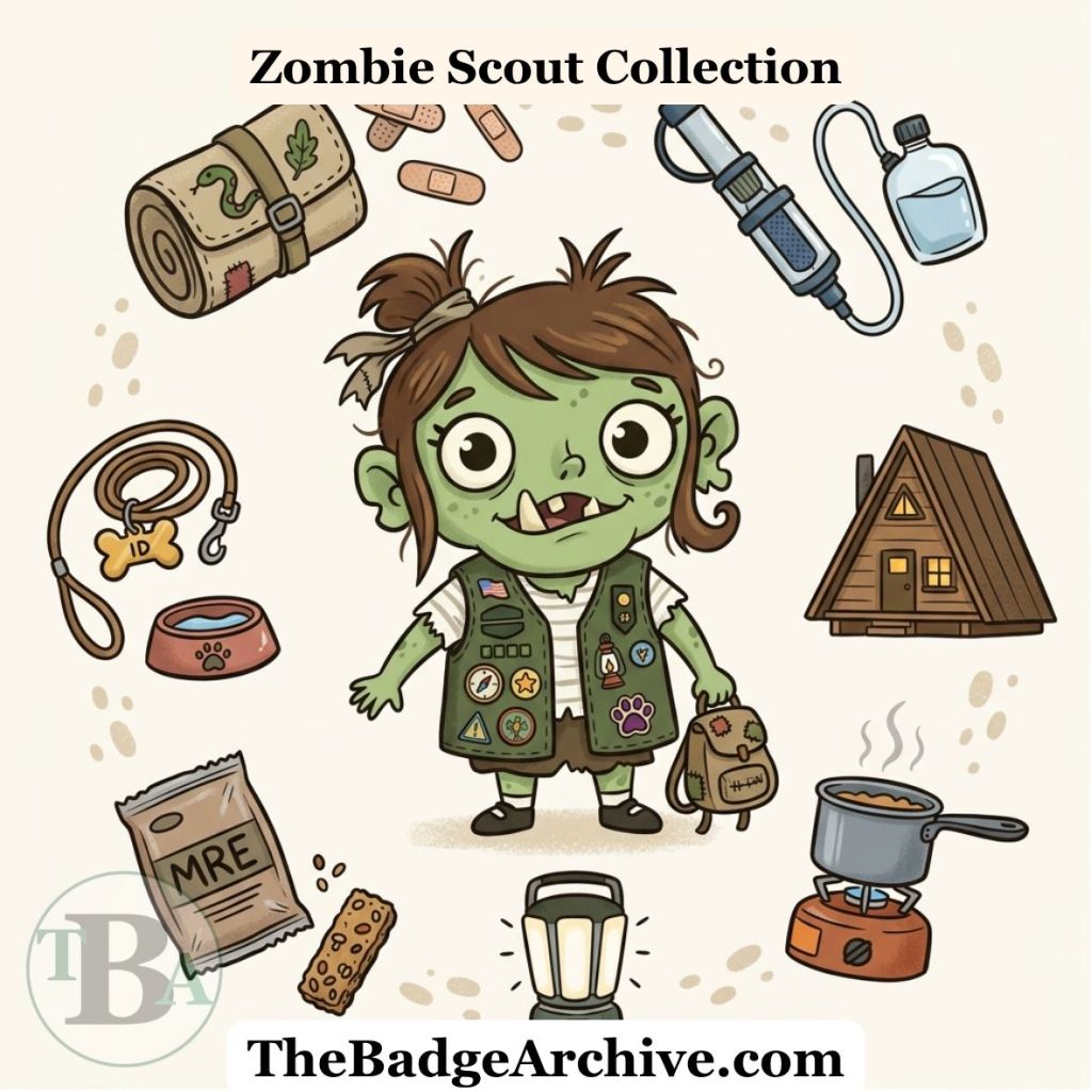 These patches are worn on the back of the uniform and can be earned by scouts of any level. The center patch features a “zombie” that matches the uniform color of the scout’s level at the time they earn it.