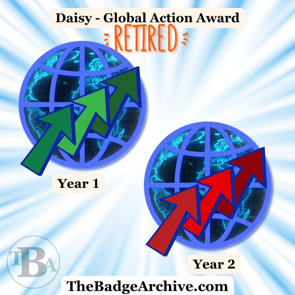 Yearly themed Global Action Award badges were released annually until 2021 when a standard Year 1 and Year 2 badge was released for all levels. Retiring in 2026.