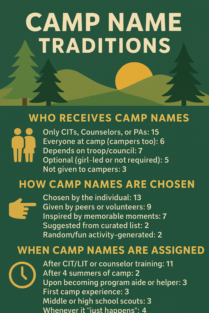 Here’s a breakdown of the camp name traditions shared by the 34 leaders, organized into statistical categories based on who receives camp names, how they’re chosen, and when they’re assigned. Since some responses include more than one method or belief, totals may exceed 34 due to overlapping practices.