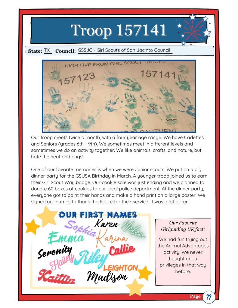 Our Senior GSUSA Scout, Scout K, has designed a template for all troops to turn in. Simply learn about Girlguiding UK for World Thinking Day, and fill it out: