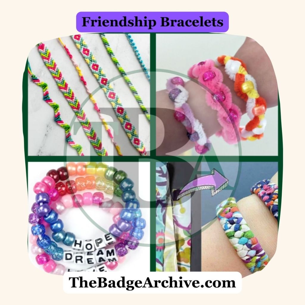 - Beaded Bracelets – Strung with pony beads or letter beads on elastic cord or string.