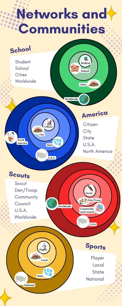 A scout is part of a den or a troop. The troop or den is part of a volunteer run community. Those communities answer a scout council. The councils answer to the nationwide organization. Those nation-wide organizations are part of a world-wide organization of other scout organizations in different countries with similar values. The network is scout, den/troop, community, council, nationwide, and worldwide.