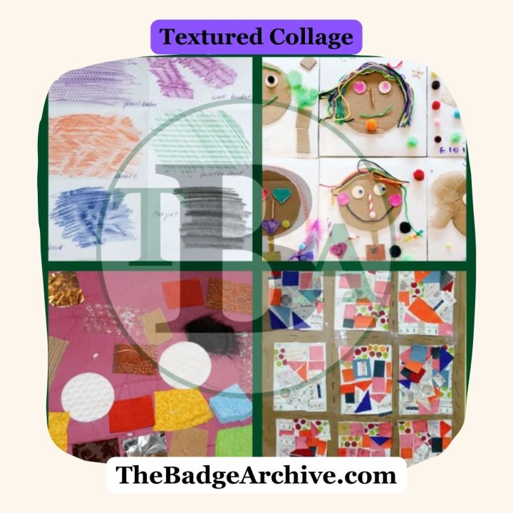 Textured Collages use materials with tactile surfaces (like fabric, foil, fuzz) to create depth and sensory interest.